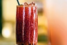 Blanda juicesorterna med teet och kyl väl. Muddla (mosa) blåbären i ett högt glas. Häll i juiceblandningen och en näve is. Fyll upp med kolsyrat vatten.