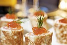 8 Tag bort plasten och garnera med en liten klick laxrom och lite dill.