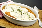 2. Smörj en liten ugnsform och häll i smeten. Grädda den i cirka 25 minuter i nedre delen av ugnen. Smeten ska stanna inuti, då är omeletten klar.