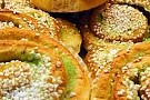 Pistagebullar: Kavla ut degen. Blanda ihop mandelmassa med lite vatten och smör tills den får en bredbar konsistens, tillsätt några droppar pistagearom eller pistageessens och blanda väl. Bre på degplattan, rulla ihop och skär i bitar. Pensla med uppvispat ägg och strö över pärlsocker innan du gräddar.