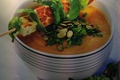Häll upp soppan i skålar och toppa med örter, pumpafrön och servera med halloumispetten.