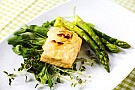 2. Koka sparrisarna lätt och garnera laxen med dem och lite ruccola.