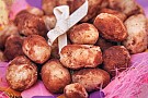Skålla och skala mandeln. Mal den i mandelkvarn eller mixa fint i en liten matberedare. Sikta florsockret i en bunke. Blanda väl med mandel, rosenvatten, vatten och ev rom. Tillsätt mer vatten om det behövs. Täck med plastfolie. Låt vila i kylen minst 1 timme. Forma små potatisar av marsipanen. Pudra dem lätt med kakao runt om och skaka dem i handen så att de blir vackert "jordiga". För alla Fri från gluten, laktos, mjölkprotein och ägg.