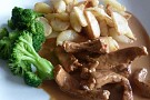 Skär köttet i skivor. Bryn i smör och salta. Om det blir för mycket kött på en gång i stekpannan, bryn då i omgångar.