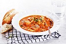 Fräs lök, vitlök och fänkål i oljan i en stor gryta. Vänd ner potatis och tomatpuré och fräs ytterligare ett par minuter. Tillsätt buljong och timjan. Låt småputtra ca 10 minuter. Tillsätt crème fraiche. Smaka av grytan med salt och peppar.