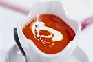 4. Mixa paprikorna med den skalade och hackade löken. Lägg blandningen i en kastrull tillsammans med buljongen och hetta upp såsen.