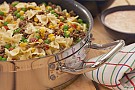 Koka pastan i rikligt med lättsaltat vatten enligt förpackningens anvisning. Fräs köttfärsen i olja. Krydda med salt, chilipeppar och gärna spiskummin. Blanda ner grönsaksblandningen i färsen och låt fräsa med några min. Låt pastan rinna av och vänd ner den i färsen. Smaksätt matlagningsyoghurten med mango chutney och salt. Servera pastapytten med såsen och strimlad isbergssallad. För alla Använd glutenfri pasta om du inte tål gluten.