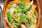 Koka pastan enligt anvisningen på förpackningen. Skär kycklingfilén i strimlor. Ansa, skölj och strimla purjolöken. Skala och skiva vitlöksklyftorna. Stek kycklingen i omgångar i 2/3 av oljan i en stekpanna ca 3 minuter. Krydda kycklingen med salt och peppar. Tillsätt vitlök, basilika, crème fraiche och vatten. Sjud kycklingen några minuter. Fräs purjolök och sugarsnaps i resten av oljan ca 5 minuter. Blanda pastan med grönsaksfräset och kycklingen. Krydda med svartpeppar. För alla Rätten innehåller gluten, laktos, mjölkprotein och ägg.