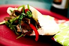 1. Strimla rostbiffen, sockerärterna, purjolöken och paprikan. Blanda samtliga ingredienser och smaka av salt och tabasco. Öppna pitabröden och lägg i salladen.