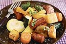 2. Skala och skär kålrot, potatis, morot och rödlök i bitar. Dela squashen i lika stora bitar. Dela korven om det behövs.