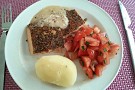 6. Dra skinnet av laxen och servera den tillsammans med de goda tillbehören samt kokt potatis.