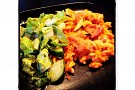 1. skiva korven, hacka löken och strimla paprikan och zucchinin. fräs allt tillsammans med pressad vitlök i stor gryta eller stekpanna (stor nog för att pastan ska få plats).