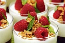 Gräddfilspannacotta med hallongelé och kaksmulor