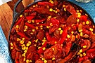 Koka riset enligt anvisningen på förpackningen. Skala och hacka löken. Dela, kärna ur och tärna paprikorna och skiva korven. Fräs lök och paprikan i oljan tillsammans med spiskummin och tomatpuré i en stor gryta. Ta upp och lägg på en tallrik. Skölj bönorna och låt de rinna av. Stek korven i grytan. Tillsätt grönsaker, bönor, krossade tomater och vatten. Låt koka ihop ca 10 minuter. Smaka av med sambal oelek, salt och peppar. Häll av majsen och blanda ner i grytan. Servera korvgrytan med riset. För alla Läs noga ingrediensförteckningen på korven. I övrigt är rätten fri från gluten, laktos, mjölkprotein och ägg.