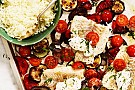 Tina fisken. Sätt ugnen på 225°C. Skölj och skiva potatisen i ca 1/2 cm tjocka skivor och zucchinin i ca 1 cm tjocka skivor. Dela, kärna ur och skär paprikan i grova bitar. Skala och skiva lök och vitlök. Blanda alla grönsakerna på en plåt tillsammans med olivoljan och örtkryddorna. Krydda med 1 tsk salt och 2 krm peppar (för 4 port). Rosta grönsakerna mitt i ugnen ca 25 minuter. Halvera tomaterna. Salta och peppra fisken. Tag ut plåten och sänk ugnstemperaturen till 200°C. Lägg fisken och tomaterna ovanpå grönsakerna och tillaga ytterligare ca 10 minuter mitt i ugnen. Servera med en klick gräddfil och gärna bröd. För alla Rätten är fri från ägg.