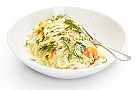 Skär laxen i mindre bitar. Ansa, skölj och strimla purjolöken. Låt sparrisen rinna av. Koka spagettin enligt anvisningen på förpackningen. Fräs purjolöken snabbt i oljan. Rör ner crème fraichen och sparrisen och låt allt bli varmt. Vänd ner dillen och laxen. Smaka av med pressad citronsaft, salt och peppar. Servera med spagetti. För alla Glutenfri: använd glutenfri spagetti.