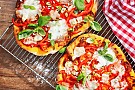 Sätt ugnen på 250°C. Sätt in en plåt i ugnen. Pizzadeg: Blanda mjöl, salt och bakpulver. Rör i mjölk och olivolja och arbeta ihop till en deg. Dela degen i fyra delar och lägg dem två och två på bakplåtspapper. Strö lite mjöl på degen, kavla eller platta ut dem till ca 20 cm i diameter (för 4 port). Dela, kärna ur och skiva paprikorna. Ansa och strimla salladslöken. Skiva mozzarellan. Bred peston på degen. Lägg på paprika, salladslök, mozzarella och solroskärnor. Strö på parmesan. Ta ut den varma plåten och dra över bakplåtspapperet med pizzorna på plåten. Grädda mitt i ugnen ca 15 minuter. Gör likadant med nästa omgång. Garnera pizzorna med basilikablad. För alla Rätten innehåller mjölkprotein.