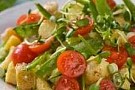 4. Halvera den nykokta potatisen eller skär den i bitar om det är större potatisar. Lägg i en skål tillsammans med sockerärter, tomater och salladslök.