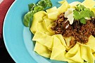 3 Häll på krossade tomater, rödvin och kalvfond. Låt puttra på svag värme i cirka 1 timme. Smaka av med salt och peppar.