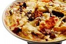 5. Häll av vattnet från grönsakerna, lägg i löken och linserna, häll över mjölkblandningen. Blanda väl.