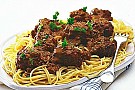 Låt ströbröd svälla mjölk i 10 minuter. Blanda med köttfärs, hackade vitlöksklyftor, finhackad gul lök, sweet chilisås, hackad färsk basilika och salt. Forma stora bollar och lägg på fuktig skärbräda. Stek dem försiktigt i olivolja. Häll i matlagningsgrädde när de har fått fin färg på båda sidorna (mjölk till vardags). Tillsätt soja och låt småputtra tills bullarna är klara inuti (det gör ingenting om de går sönder lite). Späd ev med mer vätska. Servera med spagetti.