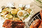 Koka potatisen. Skala lök och vitlök, skiva löken och finhacka vitlöken. Plocka av rosmarinen från kvistarna. Blanda potatisen med lök, vitlök, rosmarin, olivolja, salt och peppar. Lägg potatisblandningen på foliearket. Riv över det yttersta av citronens skal och vik ihop till ett paket. Lägg paketet på grillen 15–20 minuter. Servera med grillade kamben eller korvar.