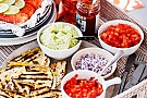 Skala och finhacka löken. Skär tomaterna i fina tärningar. Dela, kärna ur och tärna paprikan. Lägg grönsakerna i varsin skål. Skala och riv vitlöken. Dela, kärna och gröp ur och mosa avokadon. Blanda vitlök, avokado och crème fraiche. Smaksätt med salt och peppar. Lägg ut ett dubbelvikt folieark och lägg på laxen. Krydda med salt och peppar. Skär limen i tunna skivor och lägg på laxen. Vik ihop foliet till ett paket. Grilla dem ca 10 minuter. Lägg ut 4 tortillabröd (för 4 port). Blanda ost, avrunnen majs och crème fraiche och bred över bröden. Lägg på resten av bröden som lock. Grilla dem 1-2 minuter på varje sida. Skär bröden i bitar. Till servering: Servera laxpaketet med grönsaker, majsquesadilla, avokadoröra och tacosås. För alla Fri från ägg.