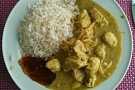 4. Bryn kycklingen i oljan i en gryta. Tillsätt lök och curry. Stek tillsammans 1 minut.