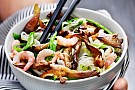 Risnudlar med ostronskivling, purjolök och sockerärter
