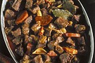 1. Skär köttet i lagom stora bitar och bryn det runtom. Lägg i gryta, strö över mjöl och vänd runt. Tillsätt kryddor och grönsaker, smula ner buljongen och slå på hälften av vattnet.