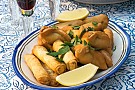 Så här gör du- texten är avsedd för 18 st. Gaffelmosa fetaosten och blanda med yoghurten. Krydda med peppar. Lägg 2 ark filodeg på varandra. Skär i 6 rektanglar, ca 13 x 15 cm. Lägg 1 msk ostkräm i ena kortänden. Vik in långsidorna. Rulla ihop. Upprepa, det ska bli 18 rullar. Stek rullarna i omgångar gyllenbruna i rikligt med olja 1-2 minuter på varje sida. Stek inte för länge, då smälter osten ut. Låt svalna och servera. För alla Fri från ägg, men kontrollera innehållet i filodegen.