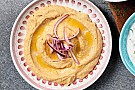 Häll av kikärterna. Skala och grovhacka vitlöken. Mixa kikärter, vitlök, tahini, citronjuice, spiskummin och olivolja med stavmixer eller i matberedare. Krydda med salt och peppar. Lägg upp i en skål och ringla över lite extra olivolja. Garnera ev med rödlök. För alla Fri från gluten, laktos, mjölkprotein och ägg.