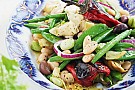 Ansa sockerärter och haricots verts. Koka dem mjuka i lättsaltat vatten, 2-4 minuter. Häll av och spola dem i kallt vatten så håller de spänsten. Tillaga sojabönorna enligt anvisning på förpackningen. Skala, halvera och skiva löken. Häll av och skär kronärtskockorna i kvartar. Häll av och skölj de vita bönorna. Häll av oljan från paprikan. Blanda haricots verts, sockerärter, sojabönor, lök, kronärtskockor, vita bönor och grillad paprika. Dressing: Vispa ihop ingredienserna till dressingen med salt och peppar. Blanda med salladen. För alla Fri från gluten, laktos och mjölkprotein, men kontrollera innehållet i dijonnaisen.