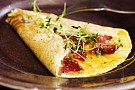 9. Lägg ost och salami eller bacon, samt ägg på pannkakorna. Rulla ihop och lägg i ugnsfast form.