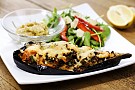Ugnsbakad aubergine med quornfärsröra och grönsallad