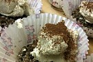 Kyl mascarponen och degen för sig. Efter någon timma kan du göra små bakelser som du ser på bilden. Pudra gärna också raw kakao över för lite extra kakaosmak.