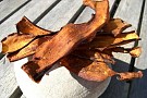 Lägg ut skivorna/bitarna på en plåt med bakplåtspapper och torka i ugn på max 50 grader med luckan på glänt ca. 3-5 timmar.