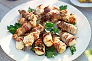 Skär halloumin i stavar. Rulla in varje bit i en baconskiva.Â