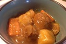 Ha rapsolja i en gryta/stor stekpanna, lägg i lökskivorna och fräs snabbt. Ha därefter i potatisen och morötterna, 7 dl vatten och låt koka. Skumma av vartefter som det kokar.