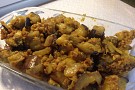 Skär av stammen på auberginen och skär i kuber á 1cm. Skölj i vatten och låt rinna av. Finhacka löken.