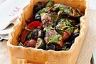 Sätt ugnen på 225°. Lägg kycklingen och alla grönsaker utom tomaterna och salladen i en ugnssäker form. Blanda soja och olja och pensla över. Krydda och stek i mitten av ugnen ca 15 min.