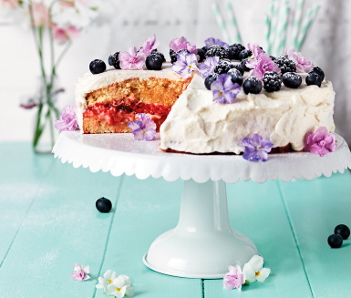 Sätt ugnen på 175°C. Smörj och mjöla en form med löstagbar kant, ca 24 cm i diameter (för 10 bitar). Blanda mandelmjöl, vetemjöl, bakpulver och salt i en bunke. Vispa samman smör, socker och vaniljsocker riktigt luftigt med elvisp. Vispa ner ett ägg i taget. Rör ner citronskal och citronjuice. Vänd försiktigt ner mjölblandningen i smeten med en slickepott. Bred ut smeten i formen. Grädda mitt i ugnen ca 30 minuter. Låt svalna helt. Fyllning: Vispa grädden fluffig. Blanda ner kvarg och florsocker.˜ Ansa och skiva jordgubbarna. Dela tårtbottnen i en över- och underdel. Bred på lemoncurden, lägg på jordgubbarna och 1/4 av gräddröran. Lägg på överdelen. Garnering: Fördela resten av gräddröran över och runt tårtan. Garnera med björnbär, blåbär och ätliga blommor. För alla Innehåller mjölkprotein och ägg.