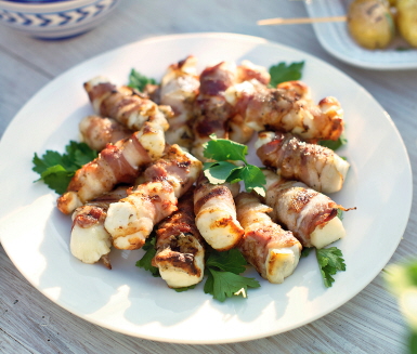 Skär halloumin i stavar. Rulla in varje bit i en baconskiva. Grilla osten ca 5 minuter, vänd den flera gånger. För alla Fri från gluten och ägg.