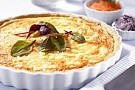 3. Vispa ägg och grädde, tillsätt osten. Smaka av med salt och peppar. Häll ostfyllningen i pajskalet och grädda ca 20 minutser tills pajen stelnat. Låt svalna.