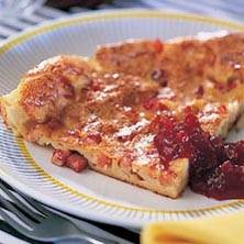 5. Servera pannkakan varm med lingonsylt eller med finstrimlad vitkål smaksatt med lingonsylt.