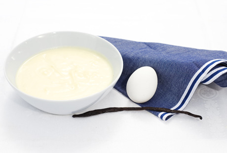 4. Ta upp vaniljstången. Vispa upp äggulorna med florsockret. Koka upp gräddvattnet.