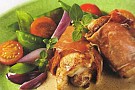 Linda skinkskivorna runt kycklingen och lägg i en ugnssäker form. Vispa ihop grädde, vinäger, fond och vitlök. Häll det i formen. Stek i mitten av ugnen ca 15 min. Strö t ex över lite färsk oregano. Servera med frästa grönsaker och ris eller pasta.