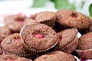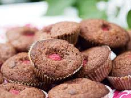 3. Fördela smeten i muffinsformar av papper ställda på en plåt. Tryck i två hallon i mitten på varje muffins.