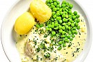 3. Servera fisken med äggsåsen och kokt potatis. Gröna ärter smakar bra till.