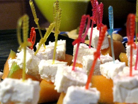 1. Vattenmelon: Skär en melon i små fyrkanter. Skär fetaost i fyrkanter, ta en tandpetare oh sätt fast fetaosten på melonen.